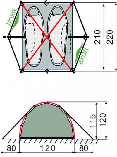 размеры внутренней палатки 210 х 120, высота 115 см;