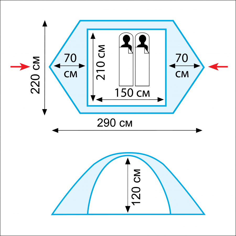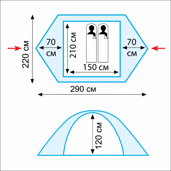 Размер внутренней палатки ДхШхВ, см 210 х 150 х 120