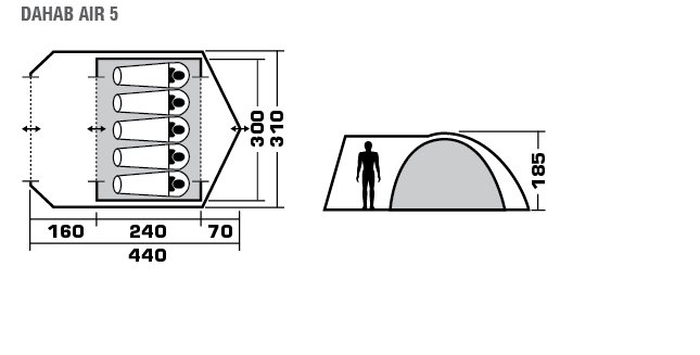 Палатка Dahab Air 5 отлично вентилируется даже в жаркую погоду за счет двух входов в спальное отделение с противоположных сторон и дополнительных вентиляционных окон. Во вместительном светлом тамбуре вы разместите все необходимые вещи и походную столовую. Отлично подойдет для отдыха выходного дня и продолжительного кемпинга.